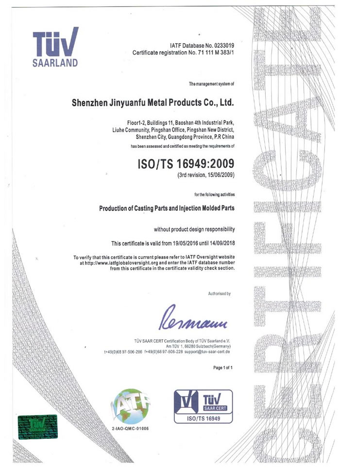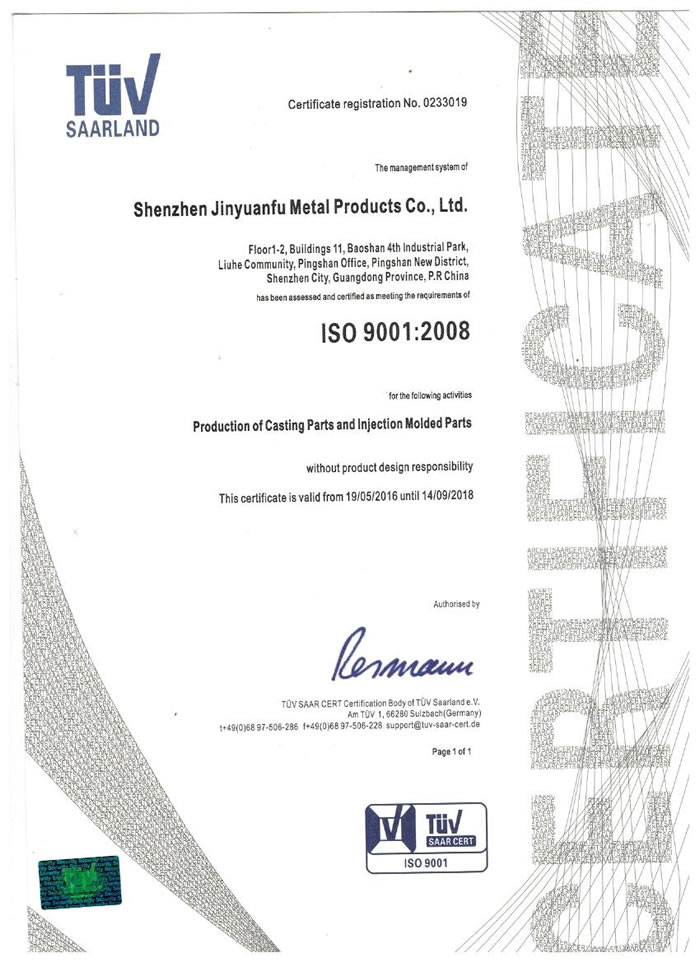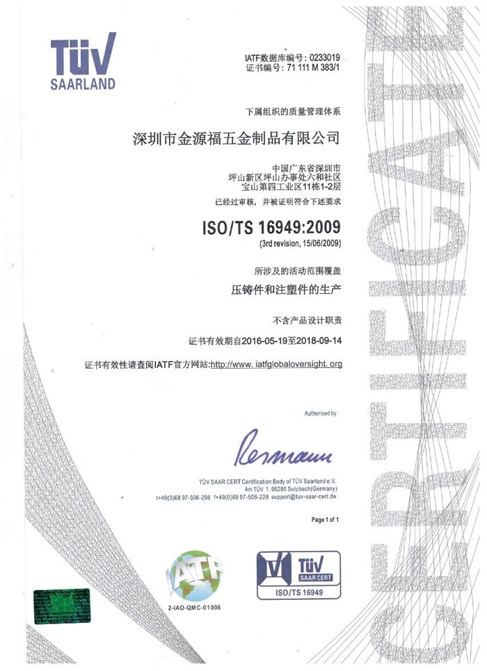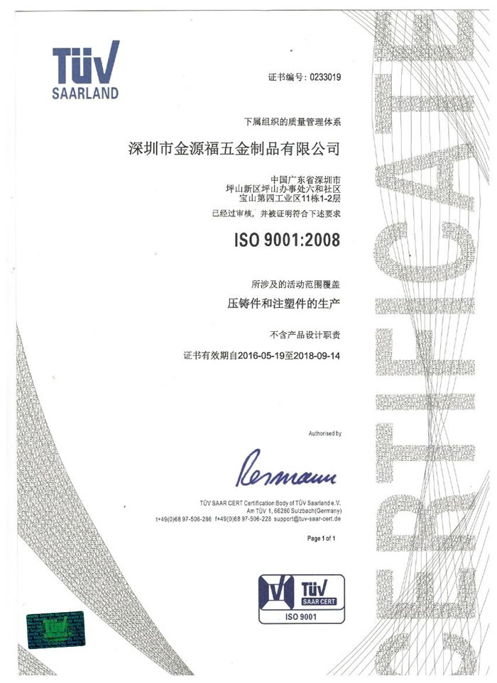 深圳市金源福五金制品有限公司成立于2003年。公司擁有8000多平方米生產廠地、開發(fā)與管理精英人才、技術專業、設備精良、交通便利、服務周全、具體設計、開發(fā)、制模、出樣、生產到成品出貨一體化模式生產廠家。已通過ISO9001:2008ISO1440/TS16949:2009國際質量體系認證。專業生產鋅合金壓鑄、鋁合金壓鑄產品、汽車配件、汽車后視鏡支架、車載導航散熱器、LED散熱器、LED燈罩、數碼電子五金結構件、家具五金裝飾件、標牌(LOGO)等五金壓鑄產品。